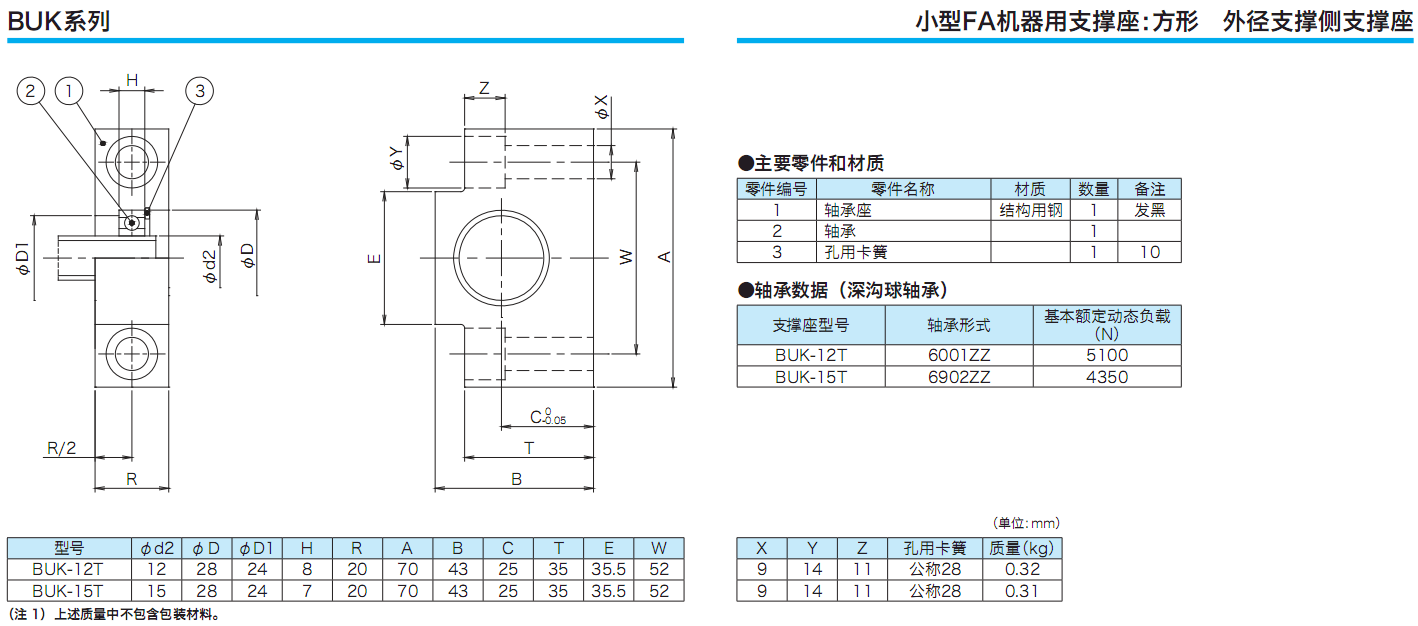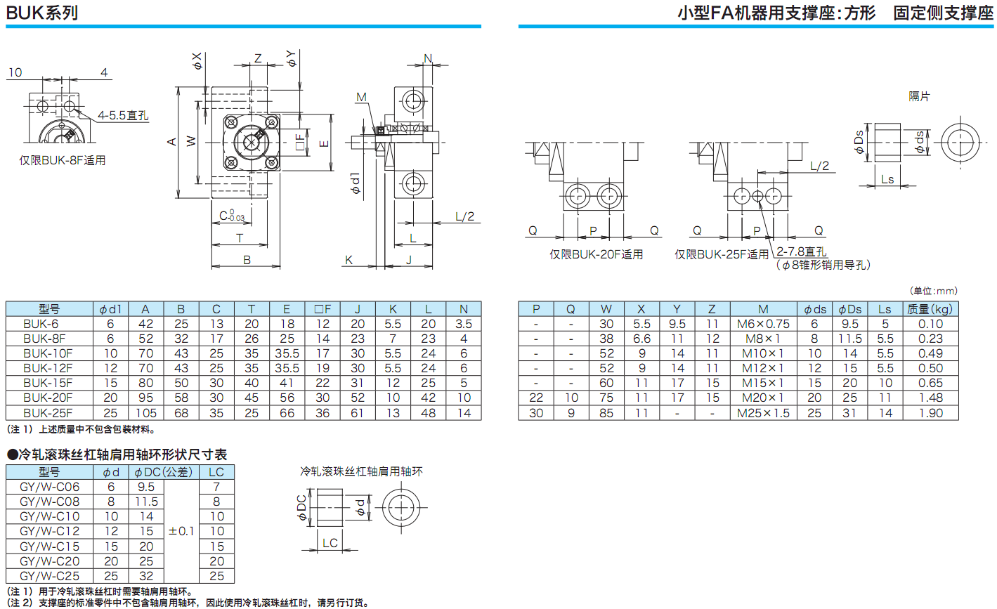 BUKE(方形)采用精度等级P0级的向心轴承。最适合于精度等级C7、C10滚珠丝杠的轻负荷、搬送用途。